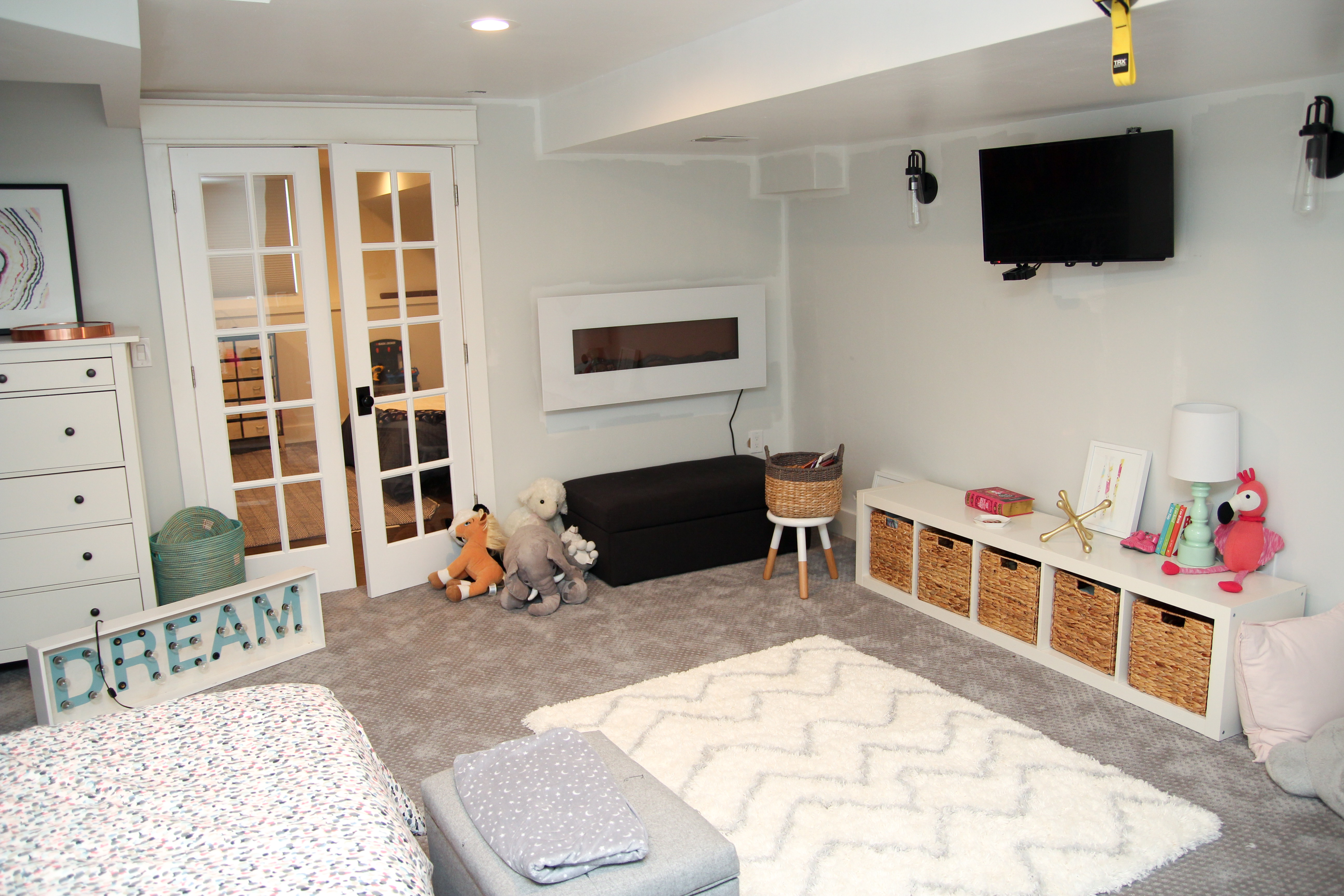This was a big design change that I did not plan at the beginning of this 6 weeks. As I thought about how to make this space both beautiful, fun, AND functional, a few things came up. Creating a proper closet solution to help with organization was on the top of this list. If you remember from earlier posts, I talked about how this room used to be my office space. We built out this space in the basement from bare concrete and had to work with the layout we had. Considering we could never officially classify this room as a bedroom because of the lack of windows, we chose not to build in a closet. I have gone about 6 months now with the DIY closet solution I created with some 1×12’s and some closet rods, but have decided I really want to create a custom closet look to polish off the room. I have the Pax system in my sons room and absolutely love the storage it provides.